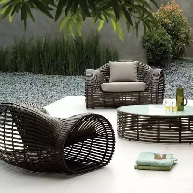 還有,一種以鐵質(zhì)為基礎(chǔ)框架的戶外家具,再加上木質(zhì)、藤編或者布藝的修飾,它們追尋著現(xiàn)代簡(jiǎn)約派的路線。